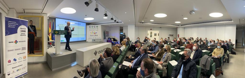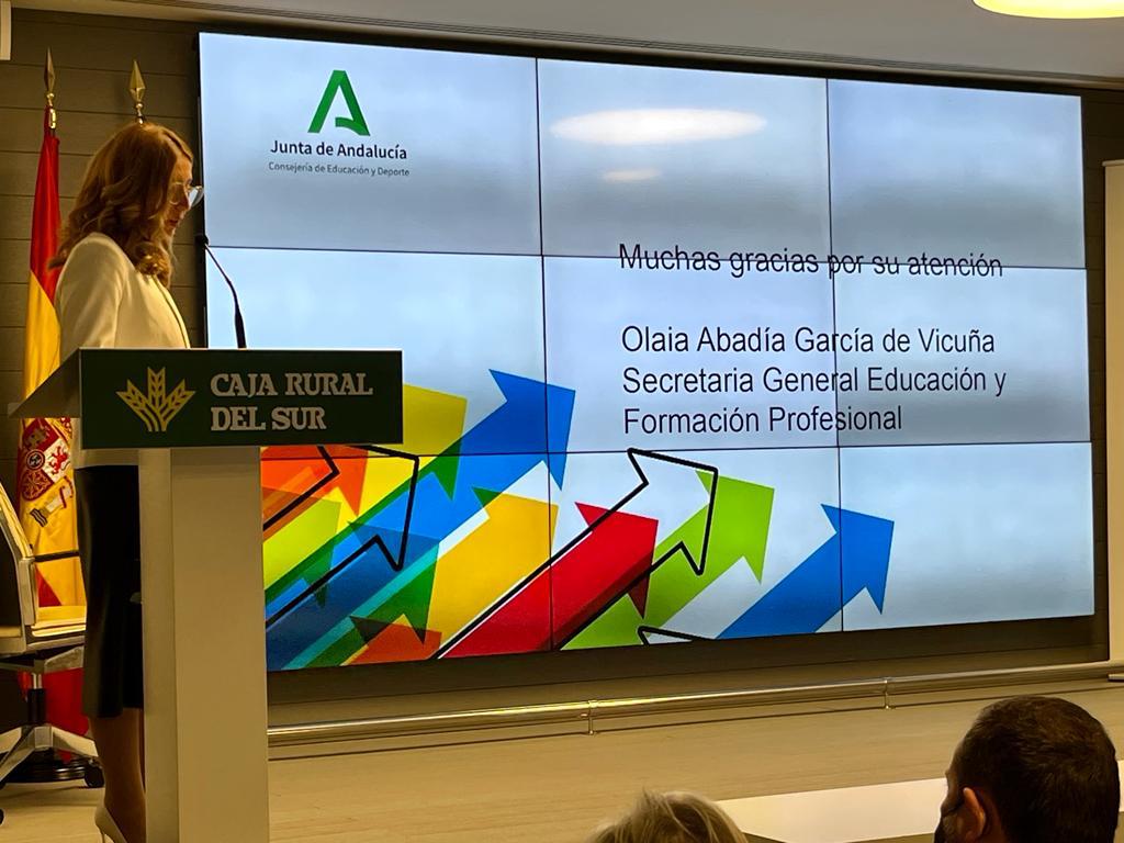 Por su parte, la Secretaria General de Educación y Formación Profesional de la Junta de Andalucía, Olaia Abadía García de Vicuña, esbozó las ocho líneas de su departamento para mejorar la empleabilidad de los jóvenes andaluces. Así detalló las distintas iniciativas de Educación en ocho puntos: acreditación de competencias, oferta educativa, #FpDual, orientación profesional, internacionalización🇪, transformación digital , emprendimiento e innovación.