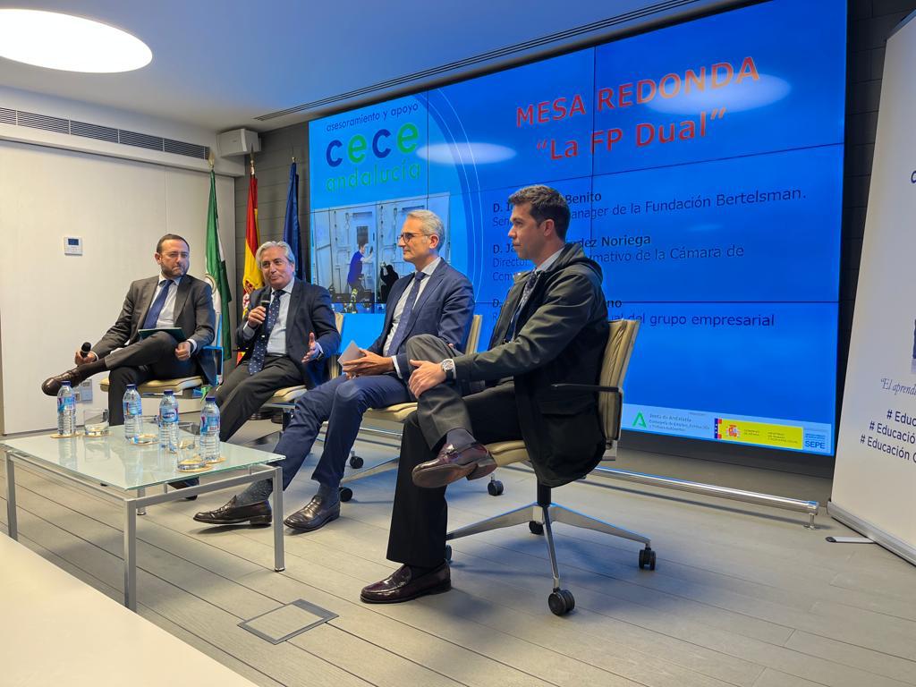 Finalmente, y para concluir el encuentro, tuvo lugar un interesante coloquio el papel de la FP Dual con Ignacio de Benito (Fundación Bertelsman), Javier Fernández Noriega (Cámara de Comercio de Sevilla) y José Carlos Laureano (COREMSA Cesur). La mesa estuvo moderada por el director del centro de FP ADA Javier Fernandez Montes. Todos coincidieron que la ley es una apuesta arriesgada, que tiene que ser más ambiciosa y que todo está por hacer, aunque algo de camino ya se ha andado.